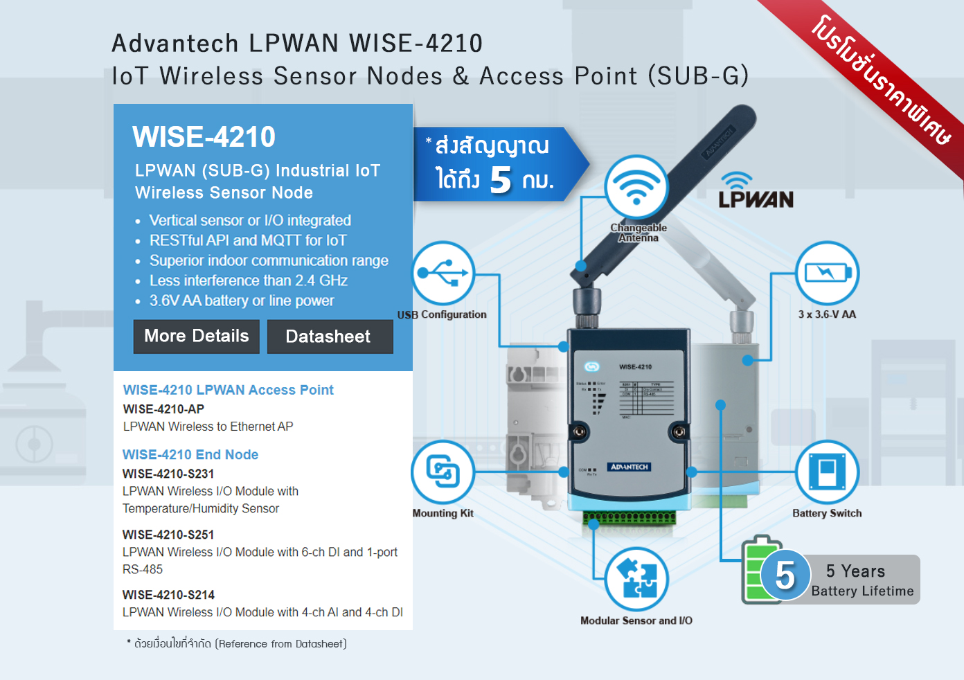 Advantech WISE-4210 ใช้การเชื่อมต่อแบบไร้สาย LPWAN (SUB-G) ซึ่งช่วยกำจัดสัญญาณรบกวนเครือข่าย ด้วยระยะการส่งสัญญาณในพื้นที่โล่งได้ถึง 5 กิโลเมตร และในพื้นที่ปิด 3-5 กิโลเมตร อีกทั้งยังมีพลังงานแบตเตอรี่ที่ยอดเยี่ยม ที่มีอายุการใช้งานถึง 5 ปี ดังนั้นโมดูล WISE จึงเป็นโซลูชันที่สมบูรณ์แบบ เหมาะสำหรับการใช้งานระหว่างเครื่องจักรกับเครื่องจักร และธุรกิจยุคใหม่ที่กำลังมองหา IoT LPWAN โซลูชัน