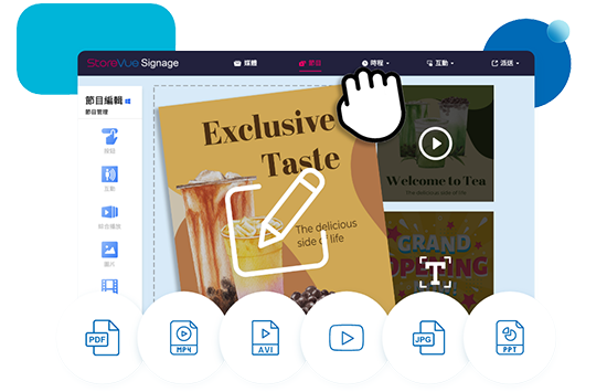 Easy Editing for People with no Designer Background StoreVue Signage’s drag and drop user interface is equipped with multiple, easily-accessed widgets including clocks, RTSP stream, tickers, music, and YouTube etc. StoreVue Signage supports more than 30 media formats such as videos, images, webpages, and documents — delivering unparalleled.