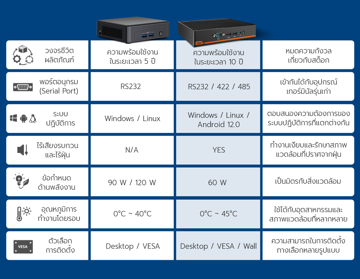 นอกเหนือจากการออกแบบที่ไร้พัดลมไร้เสียงแล้ว UBX-110 ยังโดดเด่นด้วยวงจรชีวิตผลิตภัณฑ์ที่ยาวนานขึ้น รองรับระบบปฏิบัติการหลายระบบ และตัวเลือกการติดตั้งที่หลากหลาย ระบบการติดตั้ง VESA อันเป็นเอกลักษณ์ช่วยให้มั่นใจได้ถึงประสบการณ์ที่ปลอดภัยจากความร้อน และสร้างมาตรฐานใหม่ให้กับการประมวลผลทางอุตสาหกรรม